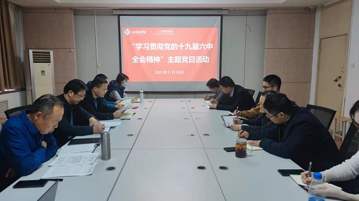 11月18日下午,人工智能学院在电教综合楼803会议室组织开展主题党日活动,专题学习党的十九届六中全会精神,学院党政领导班子及全体教师参加会议。会议由学院党总支副书记王秀金主持。