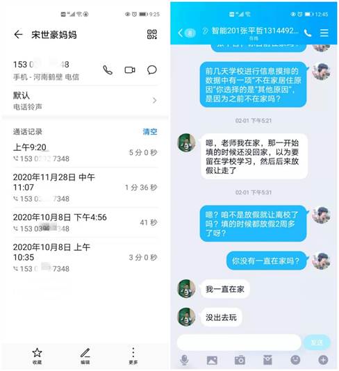 为深入学习贯彻全省教育系统疫情防控工作电视电话会议精神,认真做好学校疫情防控工作,按照学校《关于进一步加强校园疫情防控工作的通知》(校防控办〔2021〕1号)文件精神,根据校学生处对全校学生信息摸排情况和《关于开展第一次“线上家访”活动的通知》的文件要求,院团委书记郭小月通过微信、QQ、电话等方式对“不在家居住”、“期末考试不及格学生”、“建档立卡家庭”、“心理健康三级预警库”等学生群体进行第一次“线上家访”活动。