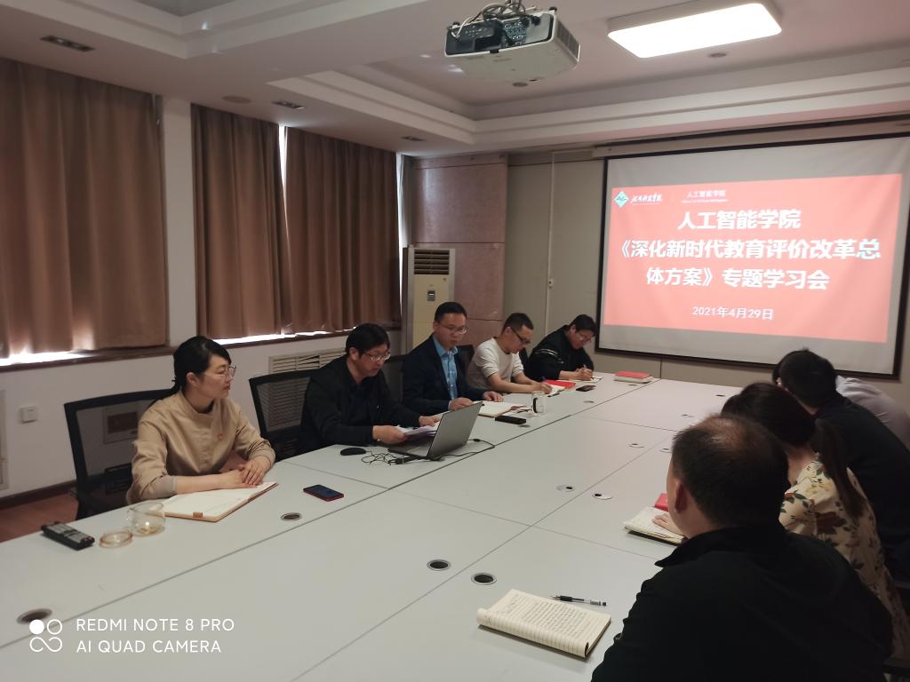 为切实将习近平总书记关于抓好《深化新时代教育评价改革总体方案》落地落实的重要指示精神,将新时代教育评价改革的决策部署宣讲、学习到位,4月29日下午,人工智能学院在803会议室组织召开《总体方案》专题学习会,学院领导班子及全体教师参加学习。专题学习会由党总支书记吴玲玲主持。