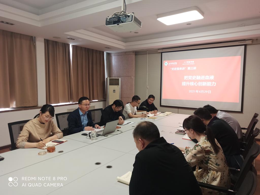 为扎实推进党史学习教育,按照校党委统一部署和人工智能学院“党史我来讲”活动安排,4月29日下午,人工智能学院在803会议室举行党史教育专题学习会暨“党史我来讲”第三讲。副院长蔡磊以《把党史融进血液,提升核心创新能力》为题为全院教师讲授党史教育课。学院党总支书记吴玲玲、院长古乐声及全体教师参加学习。