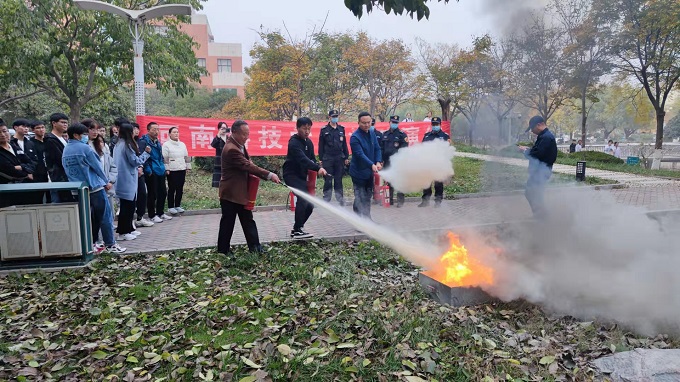 培训会上,张迪结合高校消防安全工作实际,围绕消防基础知识、火灾主要原因、火灾处置流程、火灾预防、火灾自救等几个方面内容展开培训,结合国内近期发生的一些典型火灾案例,详细讲解了建筑消防设施、设备配置以及火灾预警、火灾初期扑救、逃生自救等消防知识。培训结束后,参训人员集中在电教综合楼后广场进行了灭火器使用实战演练,在校保卫处消防科的组织和指导下,逐一使用灭火器对火源进行了扑灭作业。