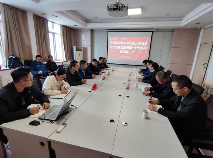 已进行多次合作,希望今后双方发挥各自优势,继续开展深度合作。王秀金从“扛起党建工作政治责任、党史学习教育特色活动和抓党建促事业发展”三个方面介绍了我院党支部建设情况。赵宏剑介绍了北自所机器人事业部党支部建设情况。双方就党支部建设交换了意见,表示不但在科研方面要加强合作,在党支部建设方面也要加强交流。随后北自所一行到我校智能机器人科研中试线进行实地参观考察,蔡磊详细介绍了我院机器人研发情况。