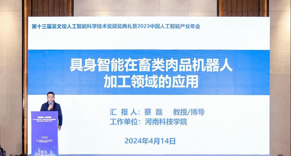 4月14日,我院蔡磊教授受邀参加第十三届吴文俊人工智能科学技术奖颁奖典礼暨2023中国人工智能产业年会,并在人形机器人与具身智能专题论坛作了题为《具身智能在畜类肉品机器人加工领域中的应用》的学术报告。