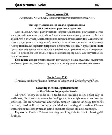 我校2022届学科教学(语文)专业俄罗斯籍硕士毕业生白雪(SMOLNIKOVA KSENIIA)的论文《俄罗斯汉语教材的选择》(英文名Selectingthe Teaching Instruments of the Chinese Language in Russia)在文法学院导师崔军红指导下,以河南科技学院为唯一通讯单位、以白雪为唯一作者,发表于《历史的力量》2022年第8卷第2期语言学卷101-108页,这是我校国际学生在国外期刊独立发表的第一篇学术论文。