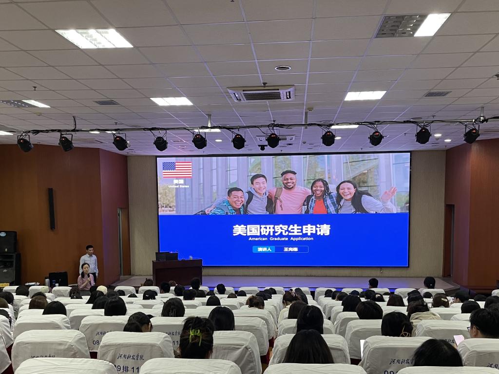 为进一步拓展学生国际视野,增强同学们对留学的了解与认知,引导学生做好学业生涯规划和选择,提升国际化人才培养质量。国际教育学院于10月26日下午邀请北京锐尔教育咨询有限公司王光栋老师在新图书馆一楼报告厅举行出国留学指导讲座,我院一、二年级学生参加了宣讲会,此外还吸引了近100名其他学院的学生到场聆听。