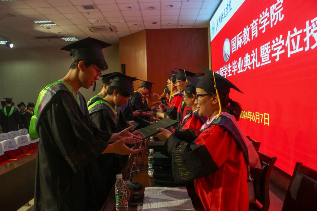 典礼在嘹亮的国歌声中拉开序幕,学院党委副书记刘凤宣读了《国际教育学院2024年优秀应届毕业生名单》,副院长沈军宣读了《河南科技学院关于授予宋毓洋等411名同学学士学位的决定》,台上领导老师为2024届毕业生代表扶正流苏,颁发学位学士证书并合影留念。