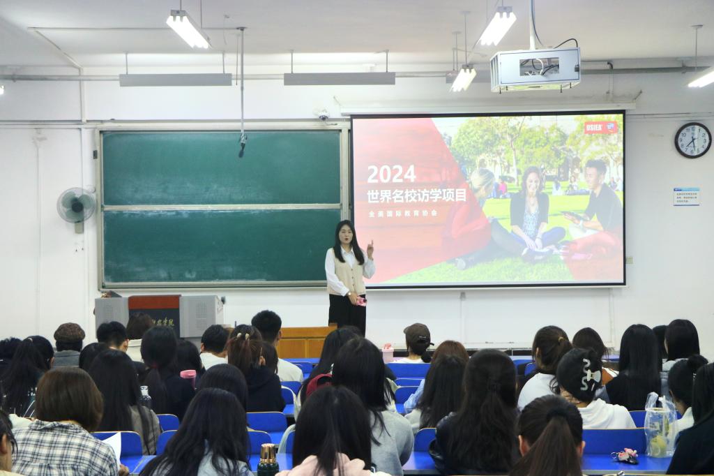 为进一步帮助学生全面了解出国留学的知识和信息,助力学生走出国门,提升国际化人才培养质量。11月1日晚,国际教育学院邀请全美国际教育协会崔婕老师在8号楼合一教室举行“出国留学指导系列讲座——欧美名校研学篇”。本次讲座吸引了近200名学生到场聆听。