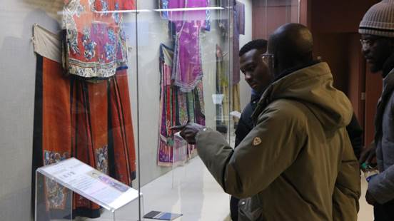 活动开始,商亚敏对国际学生的到来表示热烈欢迎。首先邀请大家观看中华传统服饰介绍纪录片。然后商院长向同学们介绍了中华传统服饰的典型特点,并就学生们感兴趣的问题进行了交流。随后,大家共同前往中原服饰文化馆。展厅里,一件件中华传统服饰映入眼帘,一丝一线、一形一物无不记录着布料、染色、刺绣等技术工艺的发展和变迁,同时更是承载着对着衣人的祈福厚愿、情意绵长。风吹仙袂飘飘举,犹似羽衣霓裳舞。古时的袅袅轻纱,仿佛穿越了时空,与众人相遇,躺在展柜的它们,正诉说着凝于其上时光的故事。倾听着专业人员的讲解,同学们纷纷停下脚步,驻足思考。
