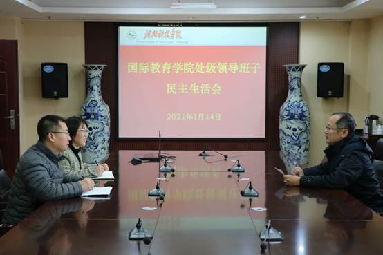 根据学校党委组织部《关于认真开好2020年度处级以上党员领导干部民主生活会的通知》要求,国际教育学院于2021年1月14日下午召开处级党员领导干部民主生活会,学院党总支书记张平、院长冯霞、副书记兼副院长吴艳兵参加会议。