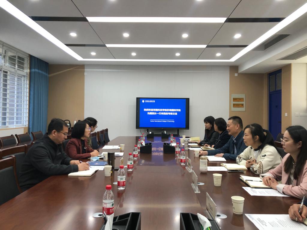 在交流会上,赵建华对冯霞一行的到来表示热烈欢迎,并详细介绍了卡洛理工国际学院整体办学情况,双方在中外合作办学、本科专业评价、学生管理、课程建设等方面进行了深入交流。