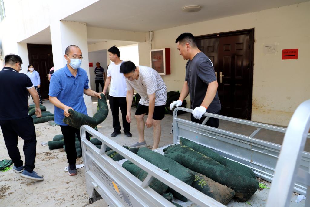 演练现场之学生公寓前沙袋堆码