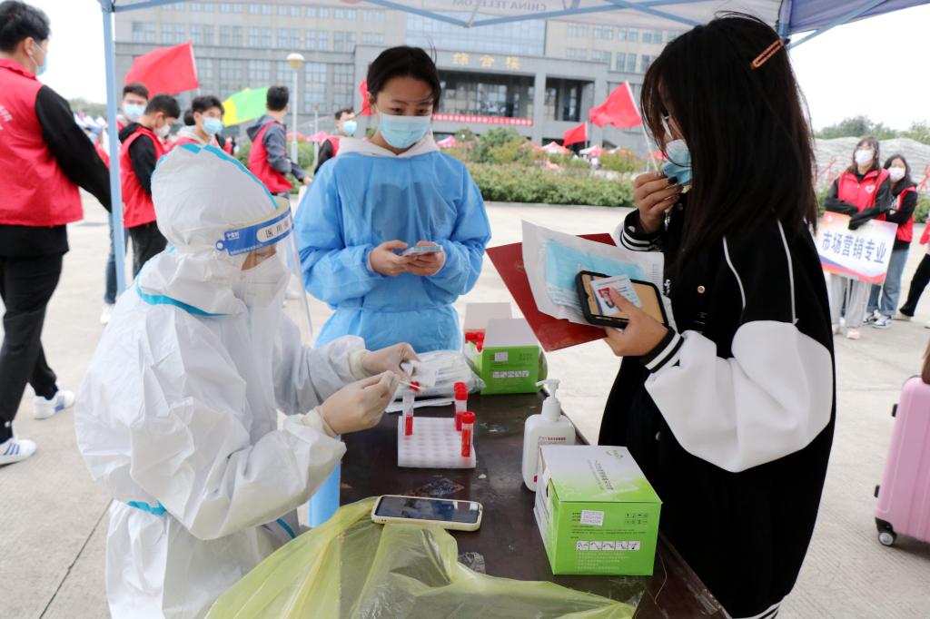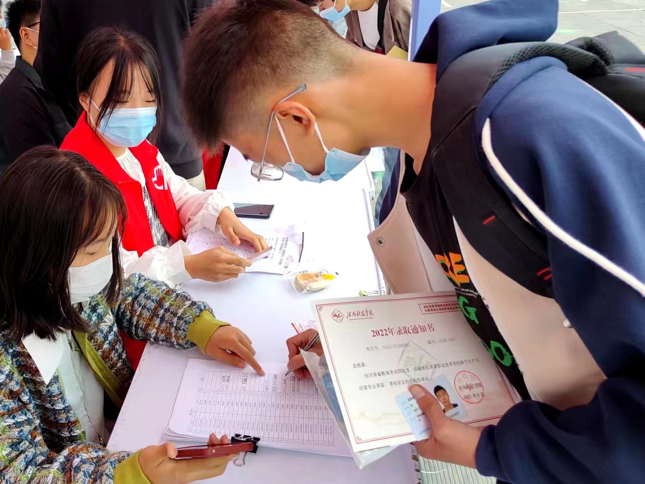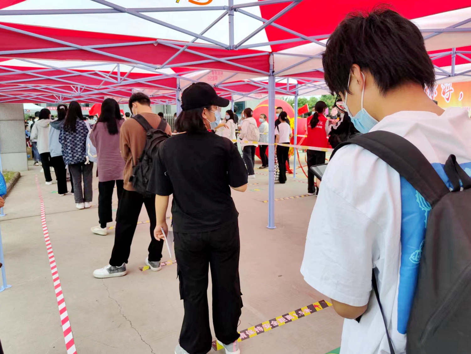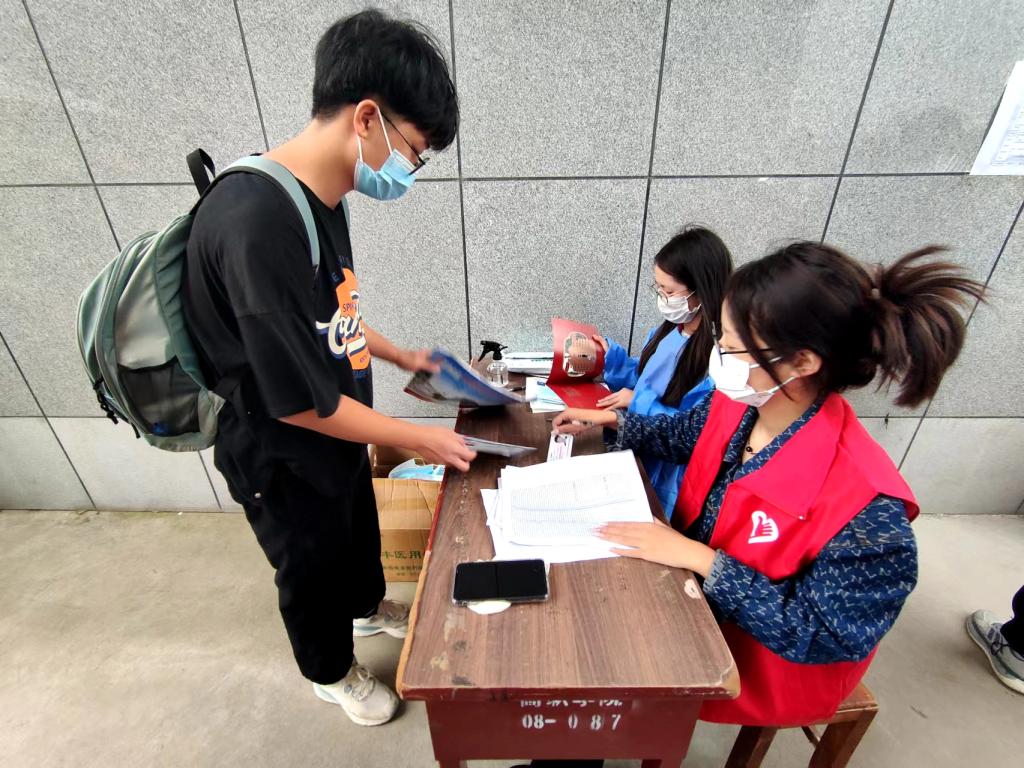 校园内喜气洋洋的彩虹门,醒目的迎新条幅,贴心的入学拍照点,来来往往的迎新接送车,呈现出一派喜庆又温馨的氛围。在学校大门入口处,新生在经过扫码测温、行李消杀、核验信息、更换口罩后步入大门,并在医护人员的指导下进行核酸检测。随后,由志愿者带领,来到各系报到处,办理报到登记、材料收取和宿舍入住等相关手续。