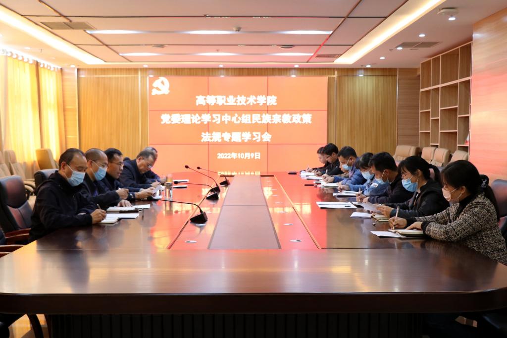 10月9日下午,高等职业技术学院党委理论学习中心组围绕民族宗教政策法规专题,在综合楼第一会议室召开年度第六次集中学习会。学院领导班子成员和各党支部书记、副书记等参加会议。会议由学院党委书记王吉田主持。