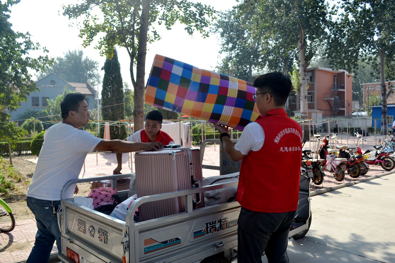 志愿者将新同学的行李拉送至宿舍楼下 |