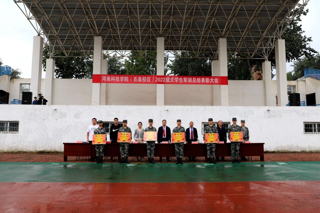 王铁固宣布军训考核获奖连队名单,四连荣获一等奖,七连、十连荣获二等奖,三连、五连、八连荣获三等奖。主席台人员为获奖连队颁奖。