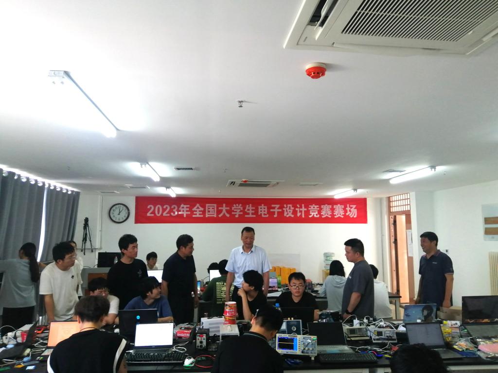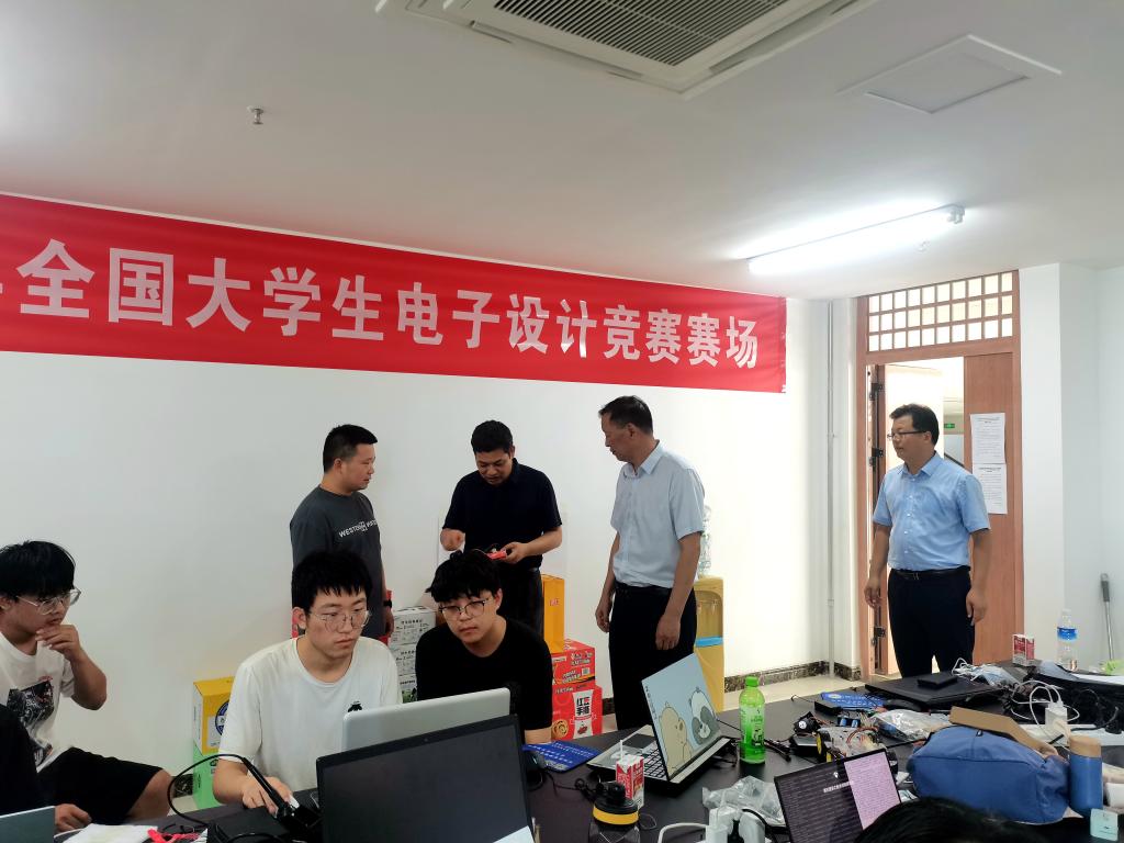 8月4日中午,高等职业技术学院院长乐玉忠、党委副书记张高峰,电子系负责人邓浩一行到学校东区弘德楼2023年全国大学生电子设计竞赛现场看望慰问参赛学生和指导教师。