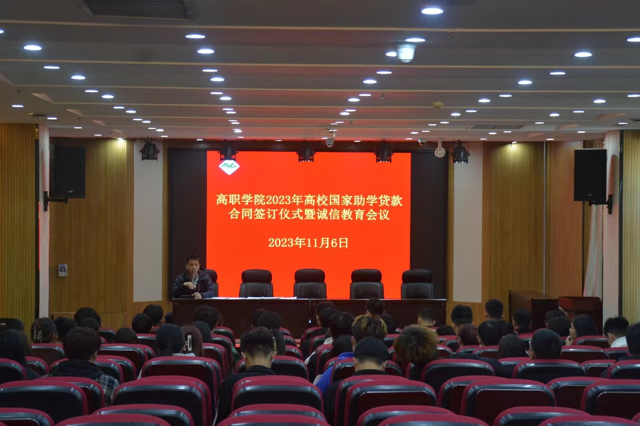 为加强贷款学生诚信教育,完善助学贷款工作流程,11月6日,高等职业技术学院在综合楼四楼报告厅举行2023年高校国家助学贷款合同签订仪式暨诚信教育会议,学生科工作人员、各系辅导员及全体申请高校贷款学生共计60余人参加了会议。