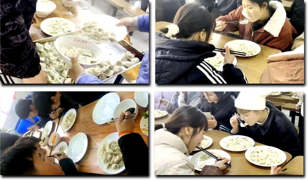 参加活动的师生们早早来到餐厅,分工协作,动作娴熟,各自拿出看家本领,展示高超技巧。现场只见擀面杖翻飞,和面的、拌馅的、切皮的、填料的,大家兴高采烈,普通的面皮经过巧手捏造,呈现出各式各样、活泼可爱的饺子造型,有元宝形、金鱼形、太阳花、小福袋、大麦穗,不一而足,大家的脸上洋溢着兴奋与自豪。部分同学不会包,也迅速被安排上“师傅”,分分钟展示效果宣布“出师”;甚至有的自组战队,向邻座“发起挑战”。