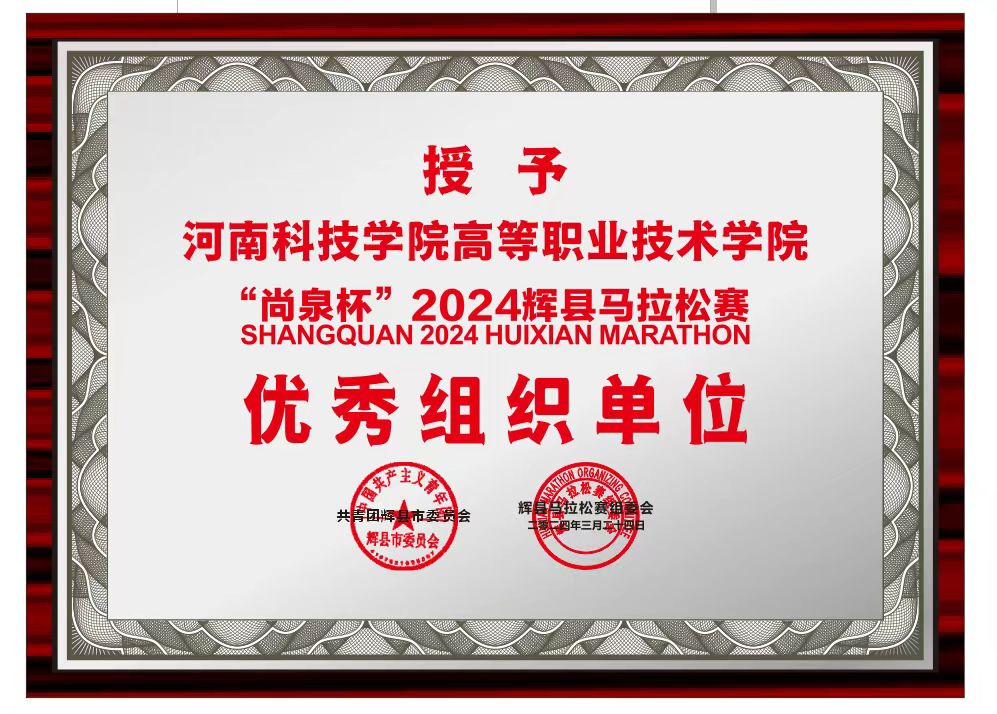 近日,高等职业技术学院被共青团辉县市委、辉县马拉松赛组委会授予2024辉县马拉松赛“优秀组织单位”荣誉称号,二十余名老师、七十余名学生被评为“优秀志愿者”。