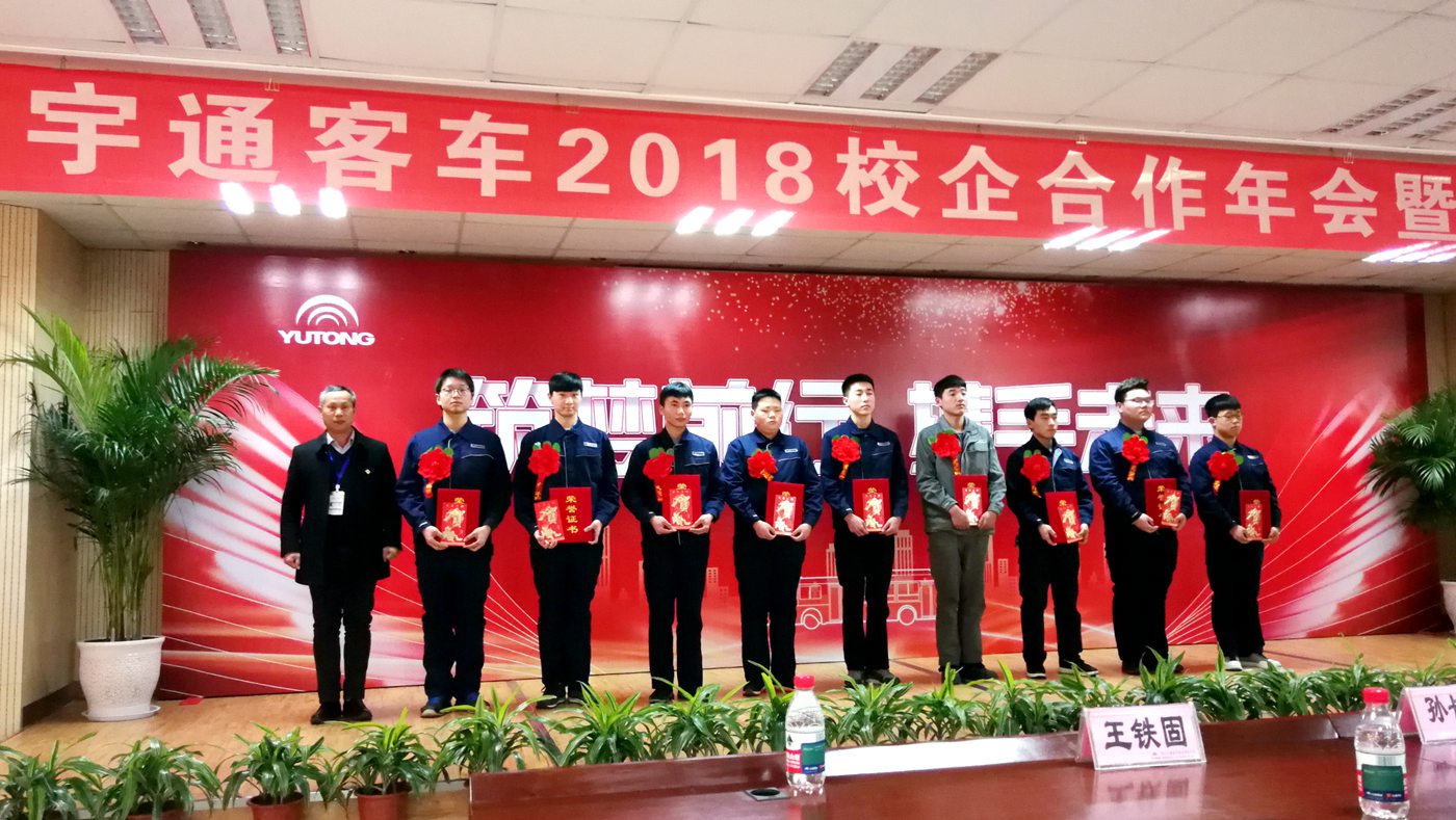 表彰大会上,高职学院获得优秀组织奖,王铁固作为颁奖嘉宾,为2018年校企合作中荣获郑州宇通客车股份有限公司“岗位能手奖”的我院学生代表颁奖。