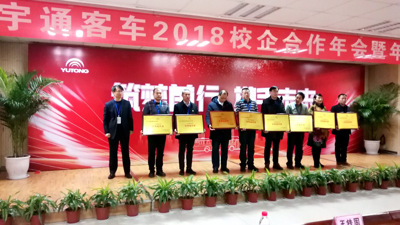 消息一:12月28日,郑州宇通客车股份有限公司举行了“筑梦前行、携手未来” 校企合作主题年会,对2018年度校企合作中优秀组织单位、老师以及学生代表进行表彰。高职学院副院长王铁固、招生就业办公室负责人应邀参加了会议。