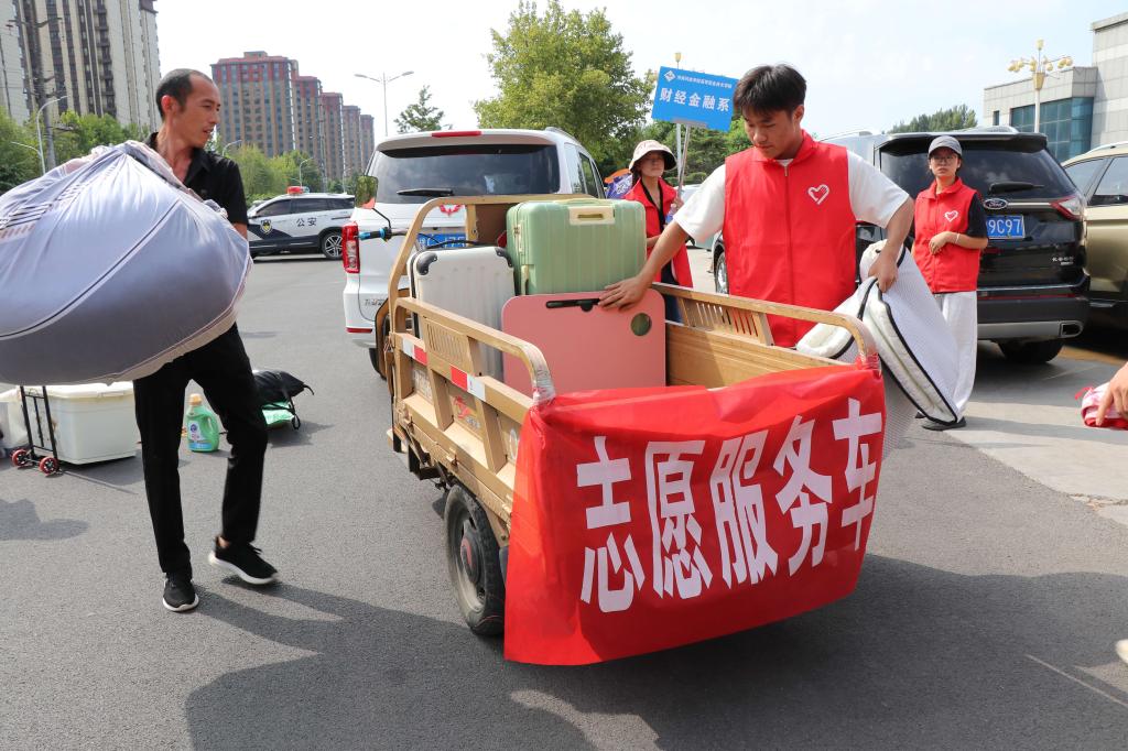 在百泉校区东大门,志愿者们高举各个专业的引导牌,指引报到的新同学;在综合楼前广场,各系迎新帐篷依次而列,为新生提供登记注册服务;爱心车队为学弟学妹们搬运行李;宿舍楼内窗明几净,一间间寝室等待新生的入住。