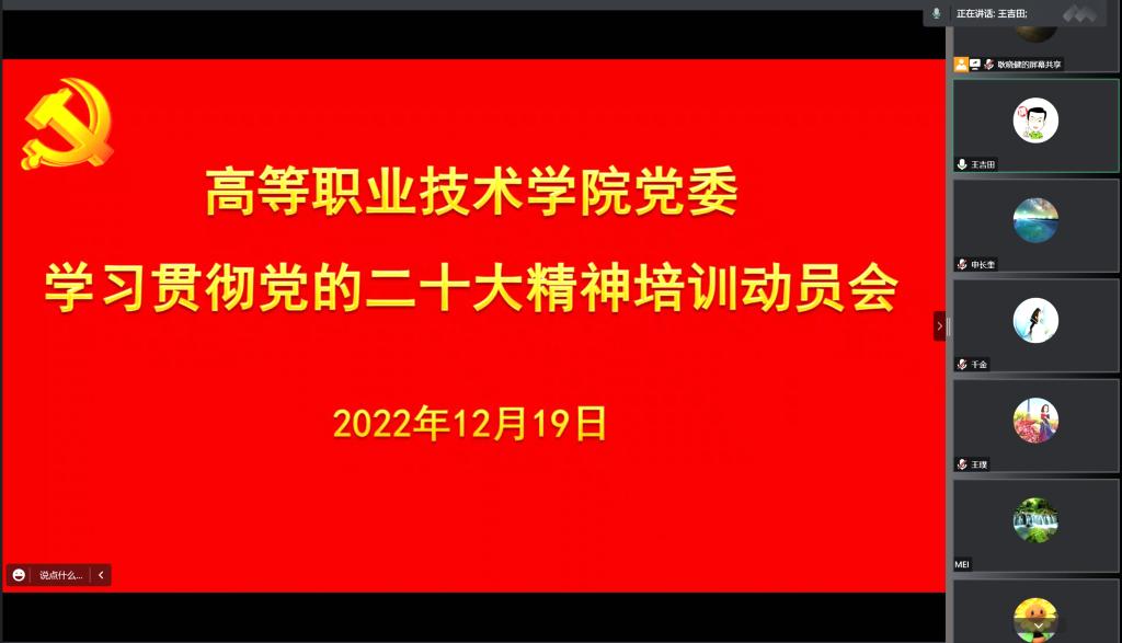 12月19日上午,高等职业技术学院以线上方式召开动员会,对科级干部学习宣传贯彻党的二十大精神集中培训作出安排部署。学院党委书记王吉田、副书记申长奎出席会议。全院50余名科级干部参加了会议。会议由申长奎主持。