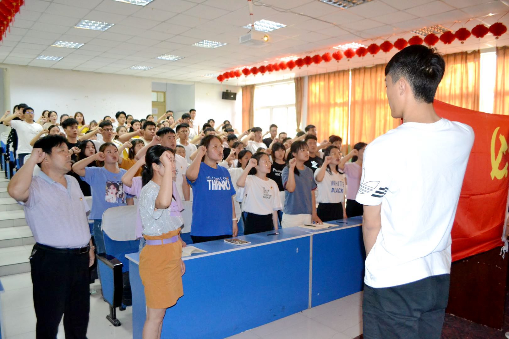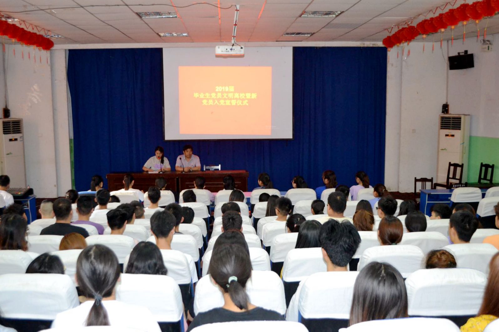6月12日,高职学院在报告厅举行2019届毕业生党员文明离校暨新党员入党宣誓主题党日活动。学院党委副书记杨国友、党建组织员李孝彦、全体毕业生党员及新党员90余人参加了此次活动。