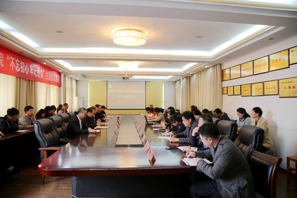 10月24日下午,高职学院党委在行政楼第二会议室召开2019年度基层党建专项述职会议。学院党委委员、副处级党建组织员、党支部书记、支部委员及党员代表参加会议。会议由学院党委副书记孙敬坤主持。