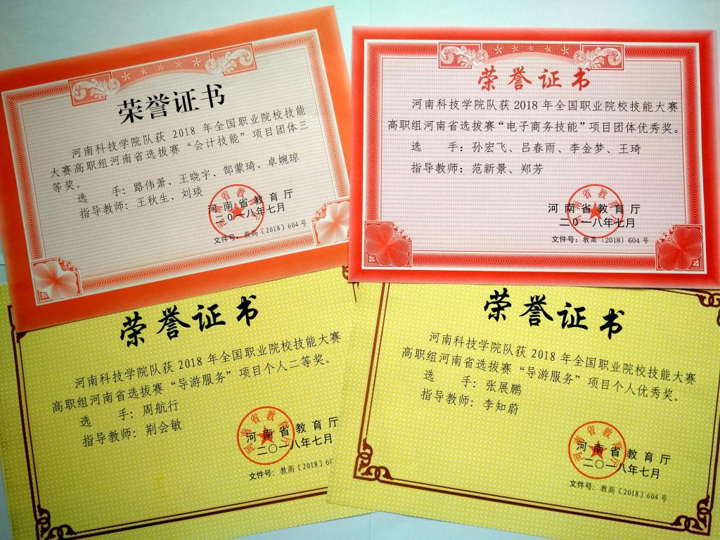 在河南省教育厅主办的第十一届河南省高职院校技能大赛暨2018年全国职业院校技能大赛高职组比赛中,由高职学院荆会敏老师指导的旅游管理17级学生周航行获得“导游服务”项目个人二等奖,李知蔚老师指导的旅游管理16级学生张展鹏获得“导游服务”项目个人优秀奖;由王秋生和刘琰老师共同指导的会计16级学生路伟萧、郜蒙琦和会计17级学生王晓宇、卓婉琼获得“会计技能”项目团体三等奖;由范新景和郑芳老师共同指导的电子商务16级学生孙宏飞、吕春雨、李金梦、王琦获得“电子商务技能”项目团体优秀奖。