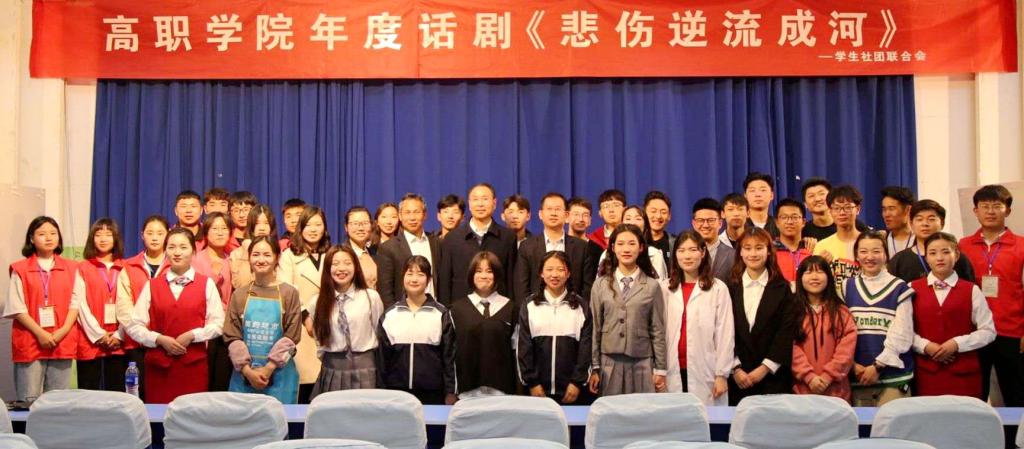 4月28日和29日晚,由高职学院团委主办、高职学院社团联合会承办的话剧《悲伤逆流成河》在多三报告厅成功举行。院领导杨国友、宋合成、吴艳兵、王铁固以及全院师生400余人共同观看了演出。