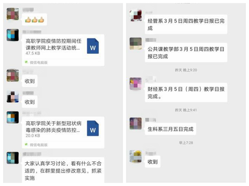 根据学校《关于做好新型冠状病毒肺炎疫情防控期间网上教学工作的通知》和《关于进一步加强疫情防控期间网上教学组织与管理工作的通知》,学院党委行政高度重视,成立了院系两级疫情防控期间网上教学活动领导小组,制定了《高职学院新型冠状病毒肺炎疫情防控期间网上教学工作实施方案》和《高职学院网上教学质量监控方案》对网上教学活动的总体要求、实施步骤和实施内容进行了安排。各系部为全面保障网上教学顺利开展,成立了有学生参与的网课监督小组,及时报告网上教学出现的问题,努力提高教学效果。