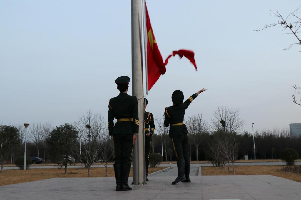 七时整,升国旗仪式正式开始。国旗护卫队迈着坚定的步伐,护送国旗至升旗台。随着庄严激昂的国歌,全体师生面向国旗行注目礼,鲜艳的五星红旗冉冉升起。