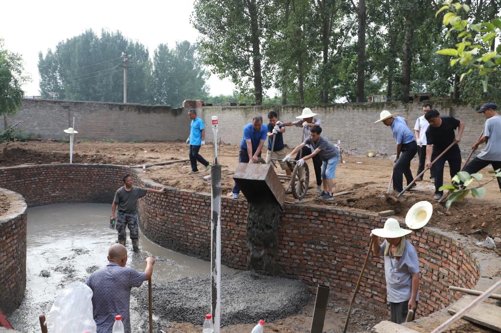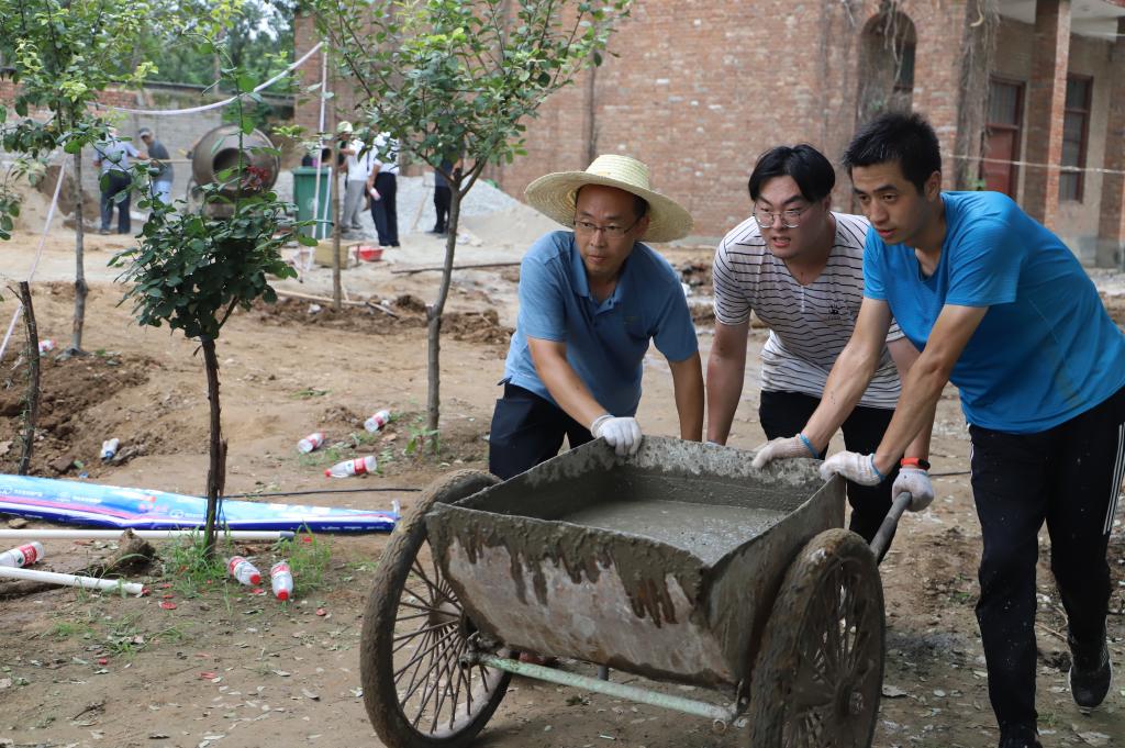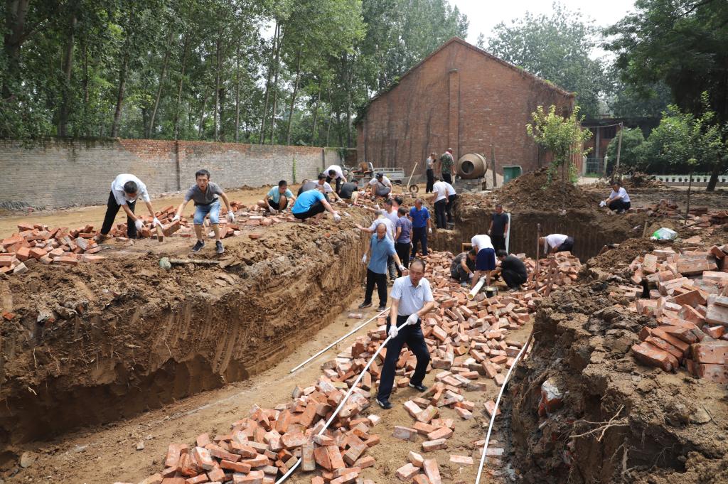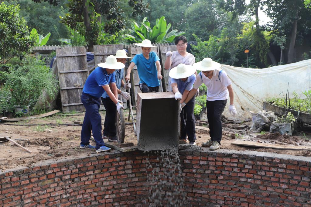 盛夏酷暑,烈日炎炎,学院领导以身作则,亲自测量水池尺寸,定位、下管、打桩、填土,给大家加油鼓劲;教工们汗如雨下,搬砖、和泥、运沙,苦活累活一起干。