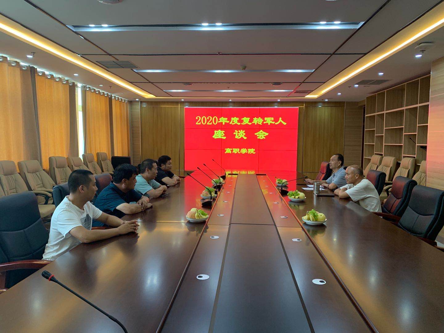 8月1日下午,高职学院在综合楼十楼会议室召开2020年复转军人座谈会,副院长宋合成、副处级党建组织员丁福虎及复转军人代表参加会议。