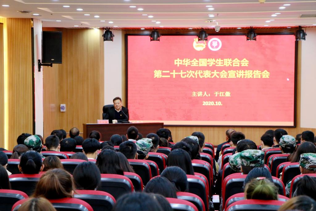 10月14日下午,高职学院在综合楼报告厅举办全国学联二十七大精神宣讲报告会,邀请校团委书记于江傲主讲。高职学院团委、学生科、各系思政专干、团总支书记及院系两级学生会代表150余人参加。