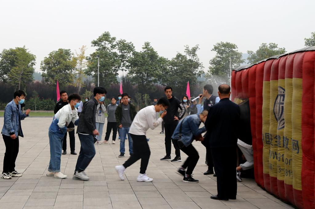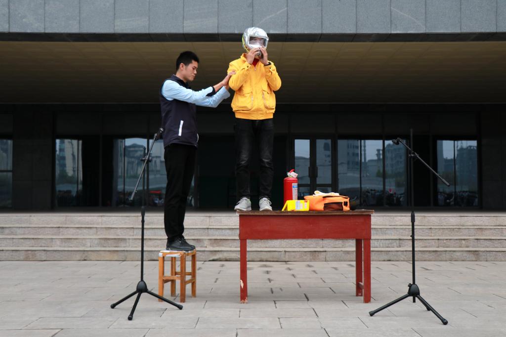 刘正科对消防的四个能力——防范、扑灭、报警及逃生进行讲解,同时普及消防基本知识,并指导学生使用灭火器进行灭火演练,同时带领学生进行火灾逃生体验。