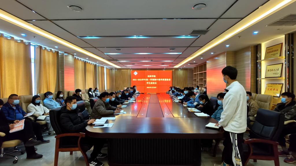 为全面了解教学情况,及时发现和解决教学过程中存在的问题,改进教学和管理工作,高等职业技术学院于11月18日上午在行政楼十楼会议室召开2021-2022学年第一学期期中教学质量检查学生座谈会。学院院长乐玉忠、副院长宋合成、王铁固、李勇超出席会议,教务科、教学质量监控科、学生科、后勤科等相关部门负责人以及各系学生代表参加了会议。会议由李勇超主持。
