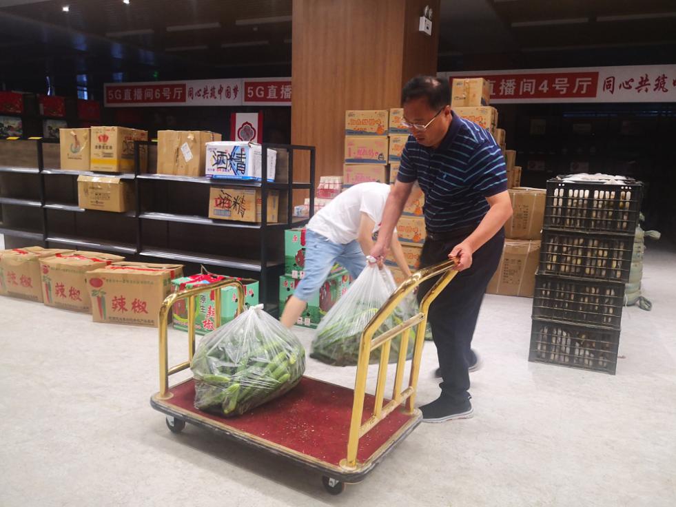 高职学院党委书记王吉田(右二)与教职工一同搬运物资 |