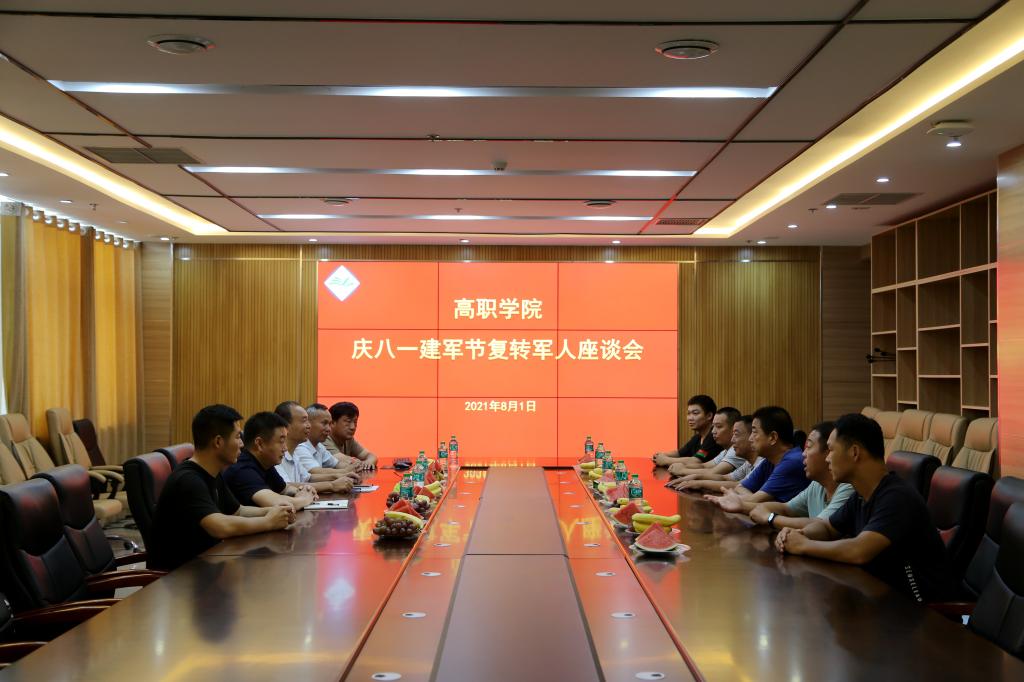 8月1日上午,高职学院在综合楼十楼会议室召开庆八一建军节复转军人座谈会,学院党委副书记申长奎、副院长宋合成、王铁固及复转军人代表参加会议。