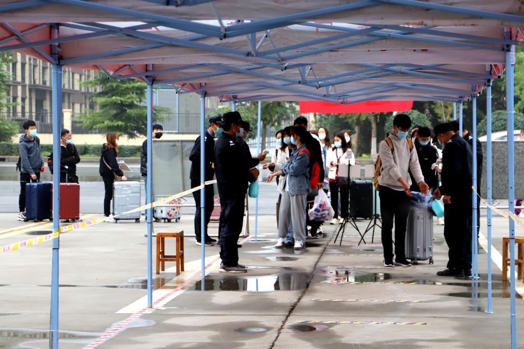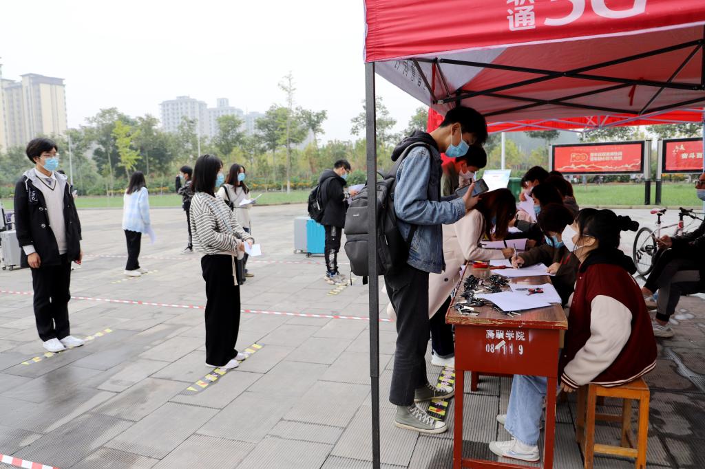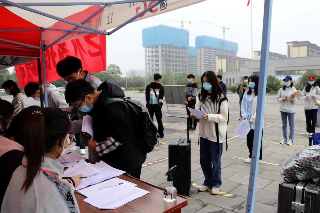 经过有序排队与消杀,同学们核验信息并更换口罩进入校园;在各系报到处,同学们填报健康信息、办理各项手续,领取宿舍识别卡;进入宿舍前进行再一次消杀与登记信息,安全入住。