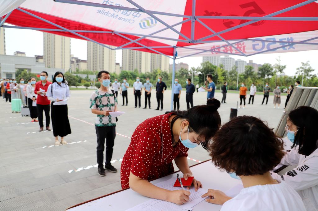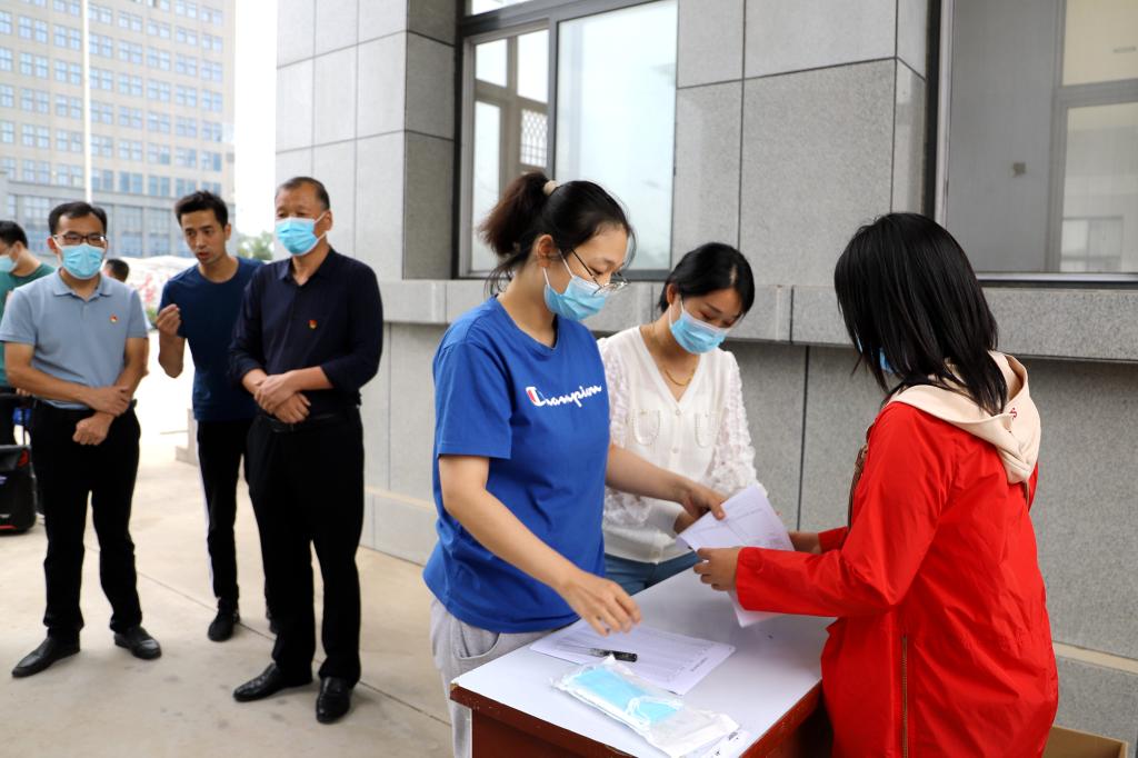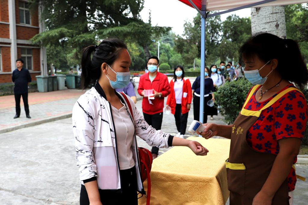 在学院东门口,学生进门前进行消杀,通过测温通道检测体温,间隔1.5米间距,替换口罩、进行身份核验,进入校园后到各系报到处进行报到手续办理。