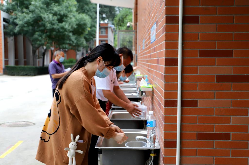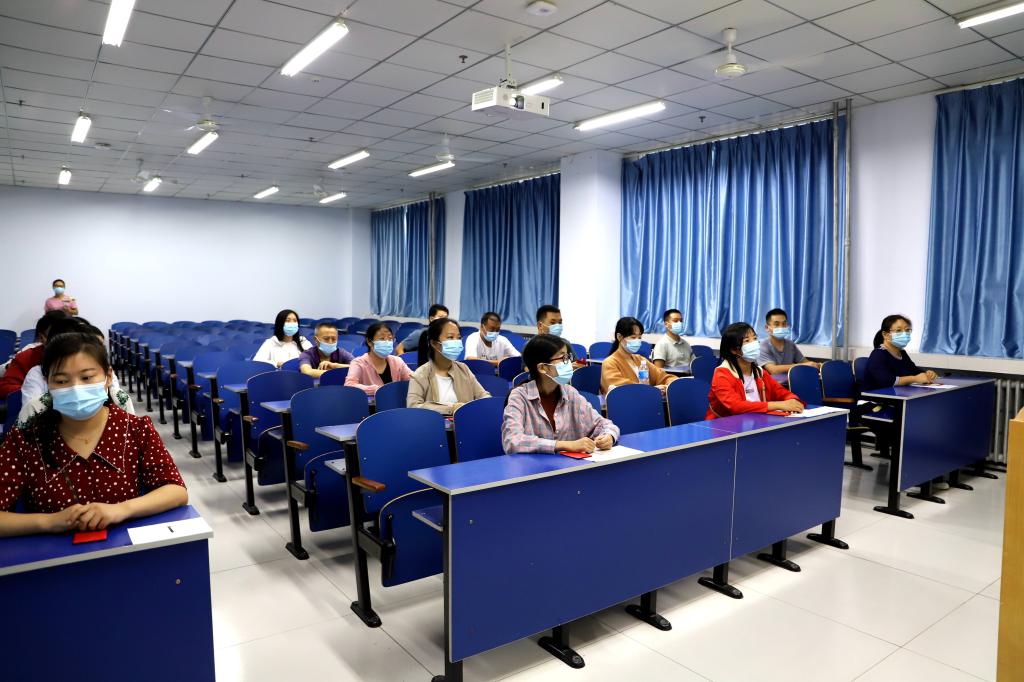 随后,学生排队进入综合楼多媒体教室参与课堂教学。任课教师主动到值班室进行消毒、接受测温,教室严格消杀和通风,学生全程佩戴口罩,间隔就座。