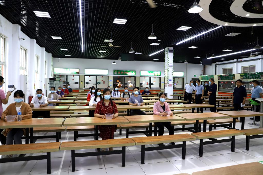 在餐厅演练现场,学生全部自带餐具,经洗手、测温、脚部消毒后有序进入餐厅,按地面标示线购买餐食,一桌一人,确保防控安全。