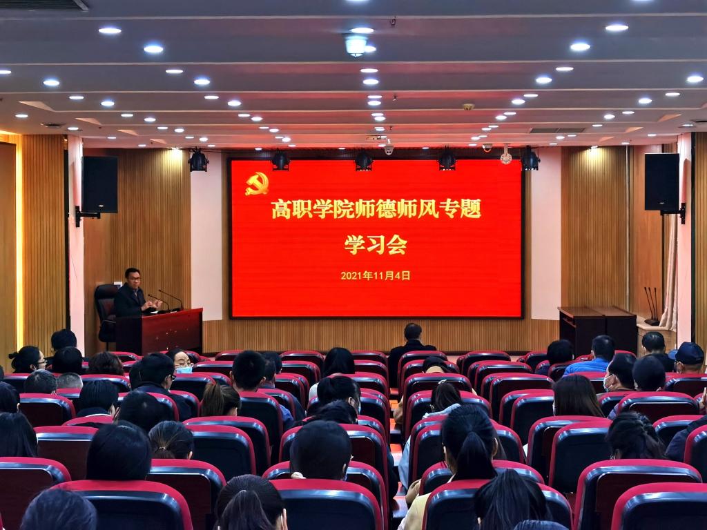 11月4日下午,高等职业技术学院在综合楼四楼报告厅组织进行师德师风教育专题学习会,学院领导班子成员及全体教职工参加了学习。