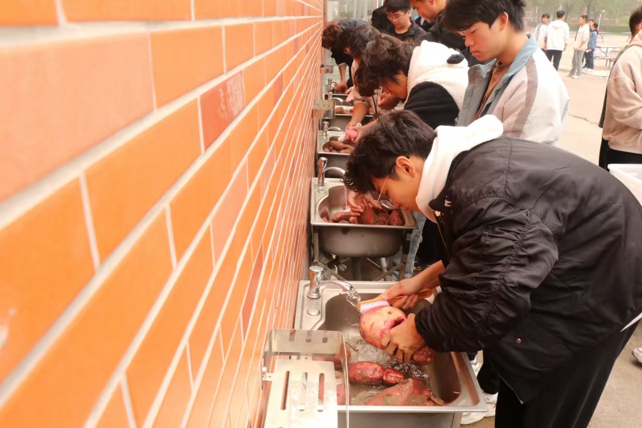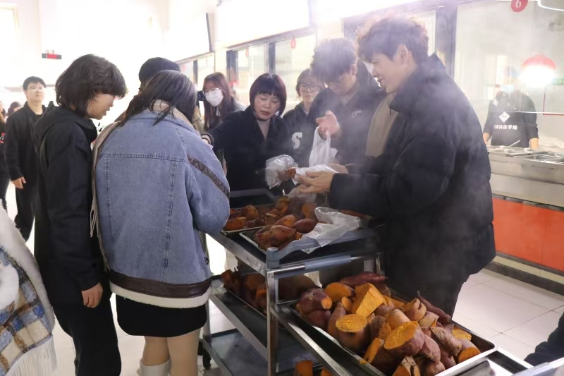 学生们用清水洗净红薯上的泥土,餐厅工作人员将红薯码放整齐放入蒸笼蒸制,蒸熟后,把热气腾腾的红薯分发给全体在校学生,让他们在初冬的天气中感受着红薯的香甜和学院的温暖。