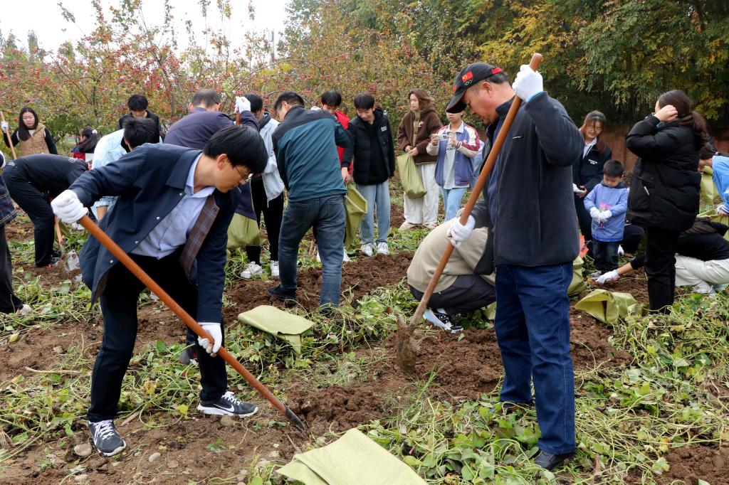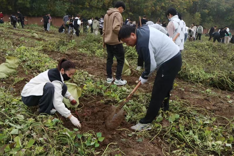在综合楼北侧责任田,学院师生们齐心协力,分工协作,有用铁锹锄头深挖的,有带着劳动手套捡拾的,有整理装袋的,有肩扛搬运的,一片热闹繁忙的劳动景象,大家干得热火朝天,享受着丰收的喜悦。