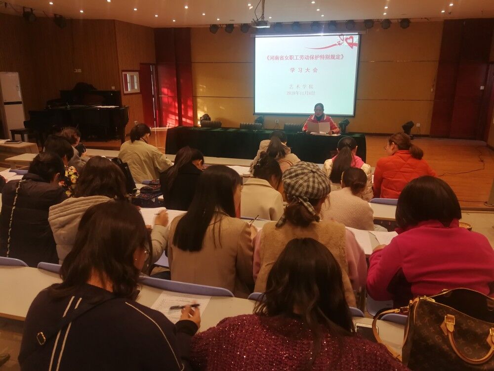 11月8日下午,艺术学院在十一合一召开了女职工学习宣传贯彻《河南省女职工劳动保护特别规定》的专题会议,艺术学院分会主席徐小玉主持学习大会,全院40余名女职工参加了会议。