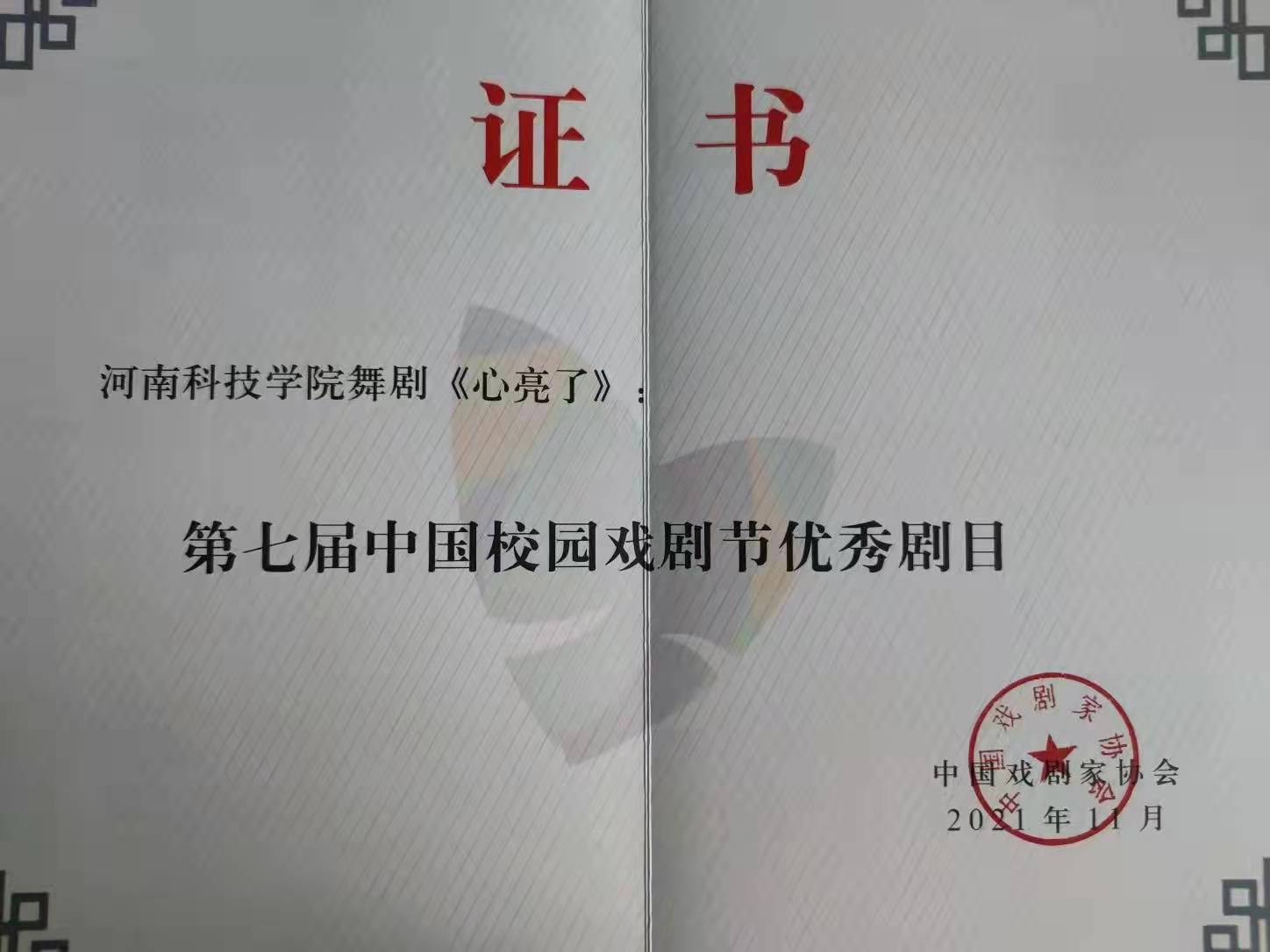 由中国戏剧家协会主办、中共深圳市委宣传部、深圳市文联、深圳市南山区人民政府联合主办,中共南山区委宣传部、深圳市戏剧家协会、南山区文化广电旅游体育局、南山区文学艺术界联合会承办的第七届中国校园戏剧节评奖,经过组委会层层筛选,我院原创舞剧《心亮了》荣获第七届中国校园戏剧节优秀剧目奖。