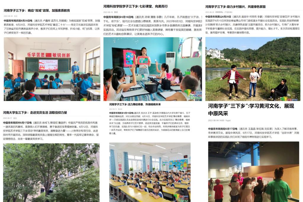 2022年暑期,艺术学院积极响应校团委号召,结合学院专业特色,将“三下乡”与“返家乡”相结合,组织了以“喜迎二十大、永远跟党走、奋进新征程”为主题的“三下乡”社会实践活动,受到中青网等外媒报道达245篇,取得了良好的社会影响。